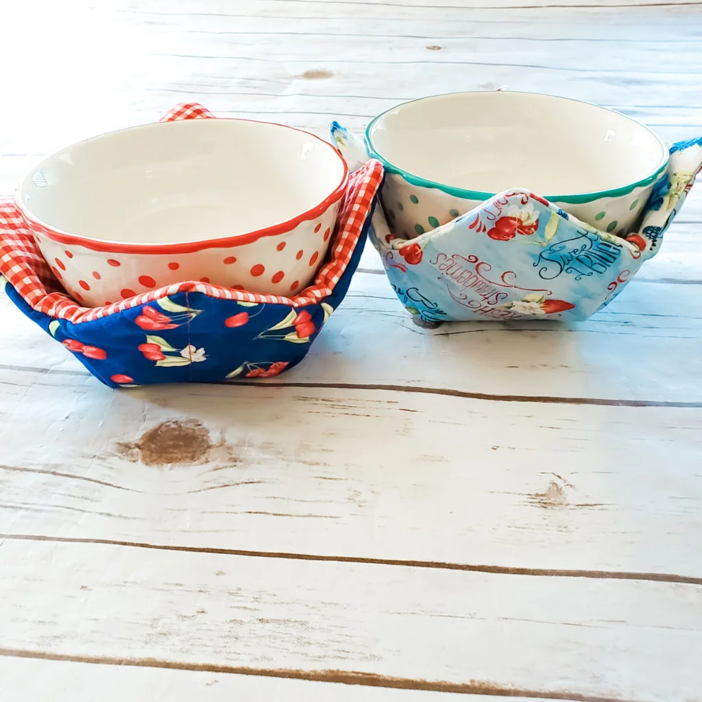 Only 100% cotton, non-metallic fabric, batting and thread, should be used if you intend to put these in the microwave. Other materials could catch fire. Works great for ice cream bowls too! Keep your hands warm while enjoying your favorite flavor.
